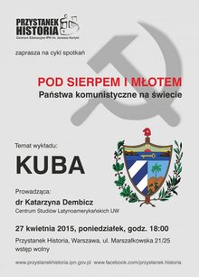 Spotkanie z cyklu „Pod sierpem i młotem” – państwa komunistyczne na świecie, który przybliża historię ruchu komunistycznego w państwach afrykańskich, azjatyckich czy południowoamerykańskich. Podczas spotkań uczestnicy dowiedzą się między innymi, jakie były podobieństwa i różnice w działaniu komunistów w poszczególnych państwach, czym różniły się stosowane metody oraz jaki był ich odbiór społeczny. Wykład Kuba – między przeszłością a przyszłością wygłosi dr Katarzyna Dembicz z Centrum Studiów Latynoamerykańskich UW.