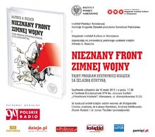 Prezentacja książki Alfreda Reischa Nieznany front zimnej wojny. Tajny program dystrybucji książek za żelazną kurtyną. W spotkaniu udział wezmą: dr Małgorzata Choma-Jusińska, badaczka historii opozycji i drugiego obiegu w PRL, dr Łukasz Kamiński, prezes IPN, Andrzej Mietkowski, redaktor naczelny portalu polskieradio.pl, Marek Rudzki, redaktor pierwszego zespołu polskiej sekcji Radia Wolna Europa. Prowadzenie: dr Janos Tischler. Organizatorami spotkania są Węgierski Instytut Kultury w Warszawie oraz Instytut Pamięci Narodowej.
