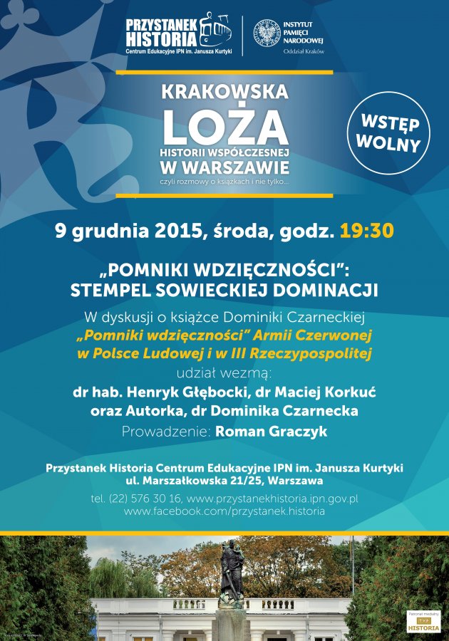 Spotkanie z cyklu Krakowska Loża Historii Współczesnej w Warszawie. O książce Dominiki Czarneckiej „Pomniki wdzięczności” Armii Czerwonej w Polsce Ludowej i w III Rzeczypospolitej rozmawiać będą dr hab. Henryk Głębocki, dr Maciej Korkuć oraz autorka. Prowadzenie: Roman Graczyk.