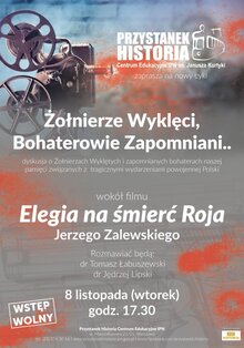 W ramach cyklu Żołnierze Wyklęci i zapomniani bohaterowie projekcja filmu Jerzego Zalewskiego Elegia na śmierć Roja o losach Mieczysława Dziemieszkiewicza ps. „Rój”, jednego z najsłynniejszych żołnierzy powojennego podziemia niepodległościowego. Gościem pokazu będzie dr Tomasz Łabuszewski, naczelnik Oddziałowego Biura Badań Historycznych IPN w Warszawie. Rozmowę poprowadzi Jędrzej Lipski, historyk, reżyser i dokumentalista.