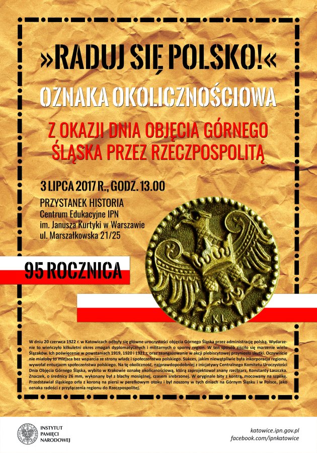 Spotkanie poświęcone 95. rocznicy objęcia Górnego Śląska przez Rzeczpospolitą. W trakcie spotkania zaprezentowana zostanie replika okolicznościowej oznaki zaprojektowanej przez Konstantego Laszczkę.