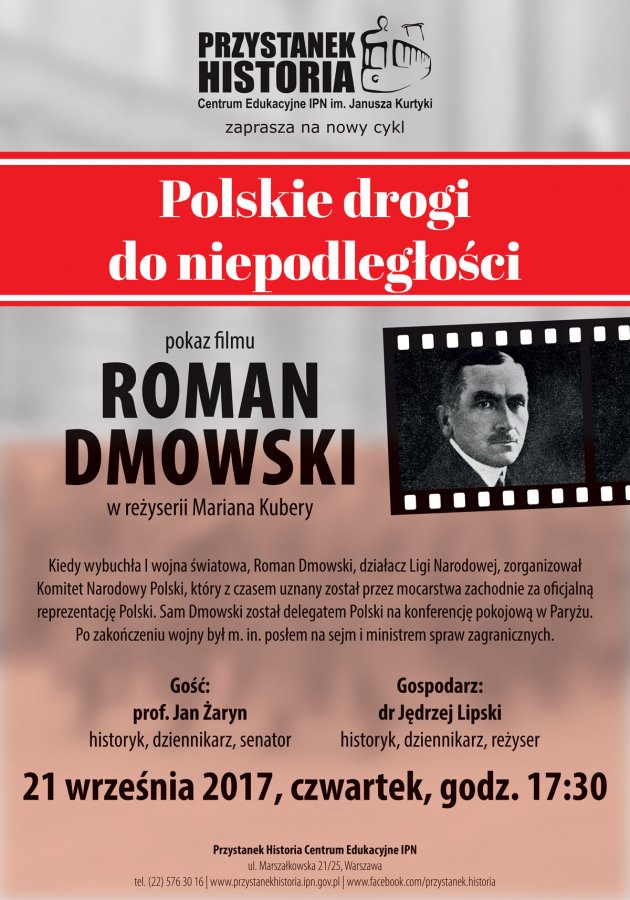 Inauguracja cyklu Polskie drogi do niepodległości poświęconego bohaterom walki o odrodzenie państwa polskiego. Na pierwszym spotkaniu zaprezentujemy film Mariana Kubery Roman Dmowski. O bohaterze spotkania dyskutować będą prof. Jan Żaryn i prowadzący – dr Jędrzej Lipski.