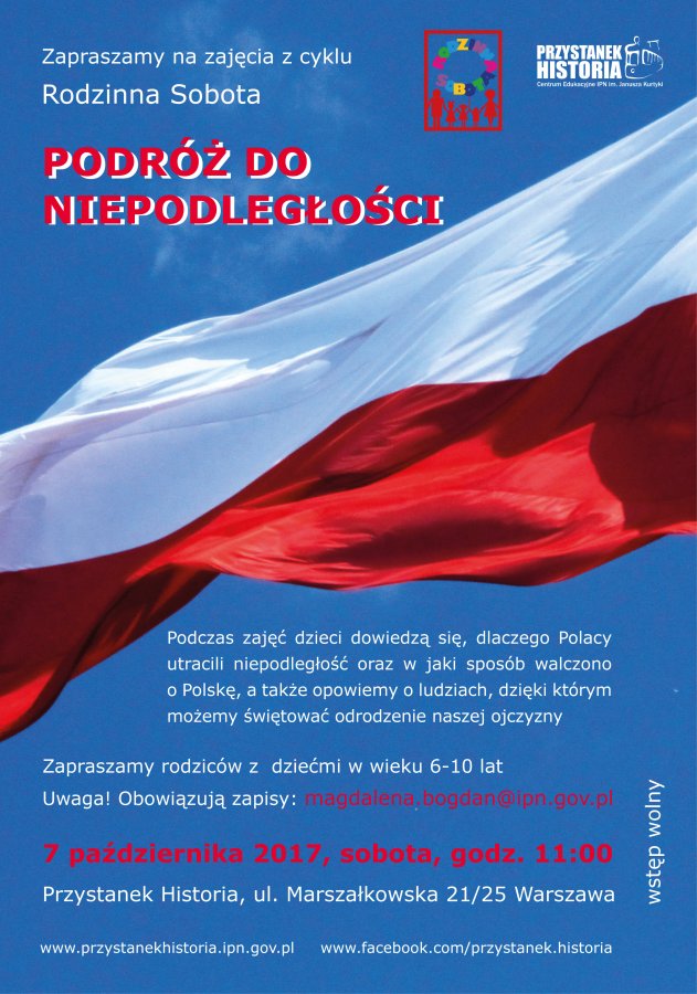 Rozpoczynamy nowy program zajęć w ramach cyklu Rodzinna sobota, który ma za zadanie przygotować uczestników do obchodów 100-lecia odzyskania przez Polskę niepodległości w listopadzie 2018 roku. W czasie zajęć dowiemy się, dlaczego Polacy utracili niepodległość, poznamy różne metody walki o Polskę, a także osoby, dzięki którym możemy świętować odrodzenie naszej ojczyzny.