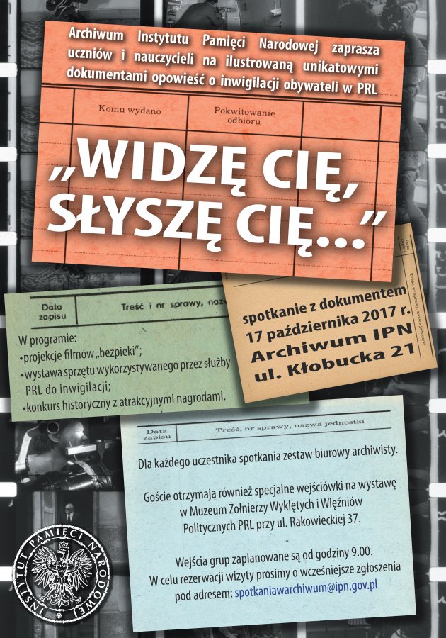 Wydarzenie organizowane pod tytułem „Widzę Cię, słyszę Cię…” odbędzie się w siedzibie Archiwum IPN przy ul. Kłobuckiej 21. Podczas spotkania archiwiści zaprezentują unikatowe archiwalia obrazujące w jakim stopniu Służba Bezpieczeństwa ingerowała w codzienne życie obywateli. Na przygotowaną w związku z wydarzeniem ekspozycję składają się dokumenty, zdjęcia i filmy ilustrujące „osaczanie” osób pozostających w zainteresowaniu służb PRL przy wykorzystaniu technik operacyjnych i sieci informatorów.