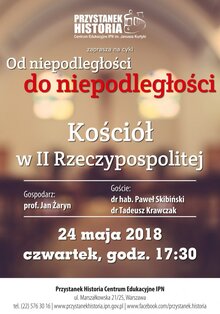 Kościół w II Rzeczypospolitej - spotkanie z cyklu Od niepodległości do niepodległości. Gośćmi prof. Jana Żaryna będą: dr Tadeusz Krawczak oraz dr hab. Paweł Skibiński.