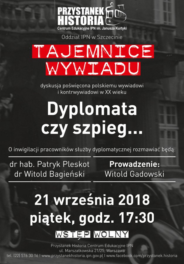 Dyplomata czy szpieg... - spotkanie z cyklu Tajemnice wywiadu. O inwigilacji pracowników służby dyplomatycznej rozmawiać będą dr hab. Patryk Pleskot oraz dr Witold Bagieński. Prowadzenie: Witold Gadowski.