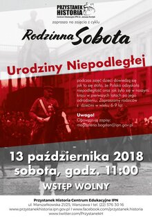 Tegoroczna odsłona cyklu Rodzinna Sobota związana jest obchodami 100-lecia odzyskania przez Polskę niepodległości w listopadzie 2018 roku. W poprzednim roku szkolnym uczestnicy poznawali historię Polski i Polaków pod zaborami, natomiast w obecnym opowiemy dzieciom jak to się stało, że Polska odzyskała niepodległość oraz jak żyło się w naszym kraju w pierwszych latach po jego odrodzeniu.