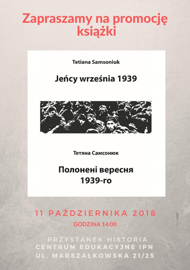 Promocja książki Tetiany Samsoniuk Jeńcy września 1939 która opowiada o losie polskich jeńców wojennych z września 1939, którzy po 17 września, po ataku wojsk sowieckich na ziemie kresowe, znaleźli się w sowieckiej niewoli.