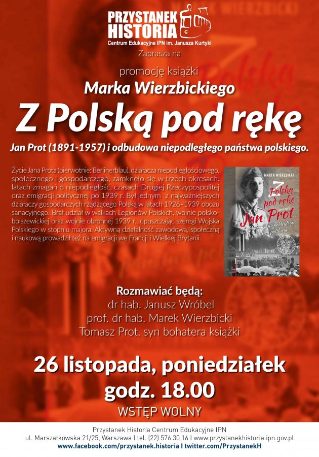 Promocja książki Marka Wierzbickiego Z Polską pod rękę. Jan Prot (1891-1957) i odbudowa niepodległego państwa polskiego. W spotkaniu udział wezmą: dr hab. Janusz Wróbel (Oddział IPN w Łodzi), Tomasz Prot, syn bohatera książki, prof. Marek Wierzbicki - autor.
