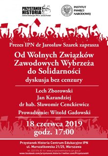 Od Wolnych Związków Zawodowych Wybrzeża do Solidarności. Dyskusja bez cenzury. Spotkanie otworzy Prezes Instytytu Pamięci Narodowej - dr Jarosław Szarek, a w rozmowie udział wezmą: działacze WZZ Lech Zborowski i Jan Karandziej oraz dr hab. Sławomir Cenckiewicz. Prowadzenie: Witold Gadowski.