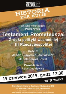 Spotkanie z cyklu Historia zza kulis – dyskusja wokół książki Pawła Kowala Testament Prometeusza. Źródła polityki wschodniej III Rzeczypospolitej. W rozmowie udział wezmą: dr hab. Sławomir Cenckiewicz oraz dr hab. Paweł Kowal. Prowadzenie: Rafał Dudkiewicz.