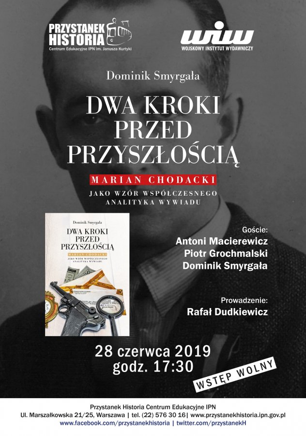 Prezentacja książki Dominika Smyrgały Dwa kroki przed przyszłością. Marian Chodacki jako wzór współczesnego analityka wywiadu. Rozmowę z dr hab. Piotrem Grochmalskim, Antonim Macierewiczem oraz dr. Dominikiem Smyrgałą poprowadzi Rafał Dudkiewicz.