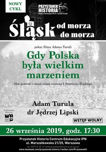 Spotkanie z cyklu Śląsk od morza do morza – pokaz filmu Adama Turuli Gdy Polska była wielkim marzeniem. Rozmowę z reżyserem poprowadzi dr Jędrzej Lipski.