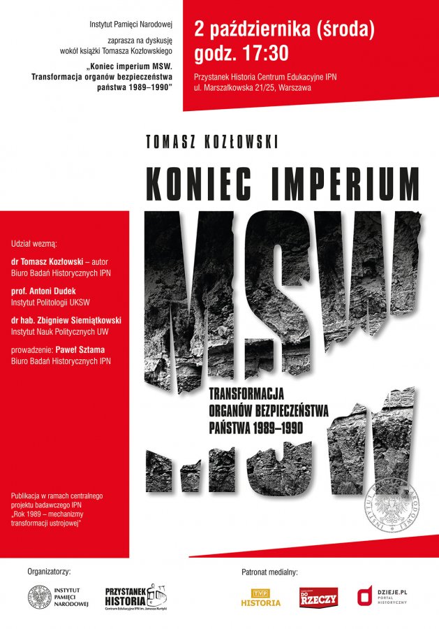 Promocja książki Tomasza Kozłowskiego Koniec imperium MSW. Transformacja organów bezpieczeństwa państwa 1989-1990. W dyskusji udział wezmą: prof. Antoni Dudek, dr hab. Zbigniew Siemiątkowski oraz dr Tomasz Kozłowski – autor. Prowadzenie: Paweł Sztama.