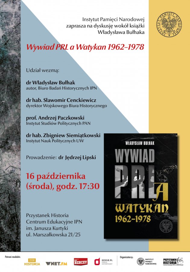 Promocja książki Władysława Bułhaka Wywiad PRL a Watykan. W rozmowie udział wzięli: prof. Andrzej Paczkowski, dr hab. Sławomir Cenckiewicz, dr hab. Zbigniew Siemiątkowski oraz dr Władysław Bułhak – autor. Prowadzenie: dr Jędrzej Lipski.