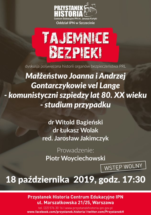 Małżeństwo Joanna i Andrzej Gontarczykowie vel Lange - komunistyczni szpiedzy lat 80. XX w. - studium przypadku – spotkanie z cyklu Tajemnice bezpieki. W dyskusji udział wezmą: dr Witold Bagieński, dr Łukasz Wolak oraz red. Jarosław Jakimczyk. Prowadzenie: Piotr Woyciechowski.
