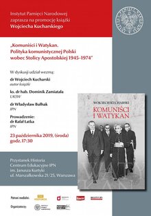 Promocja książki Wojciecha Kucharskiego Komuniści i Watykan. Polityka komunistycznej Polski wobec Stolicy Apostolskiej 1945-1974. W dyskusji udział wezmą: ks. dr hab. Dominik Zamiatała, dr Władysław Bułhak oraz dr Wojciech Kucharski - autor książki. Prowadzenie: dr Rafał Łatka